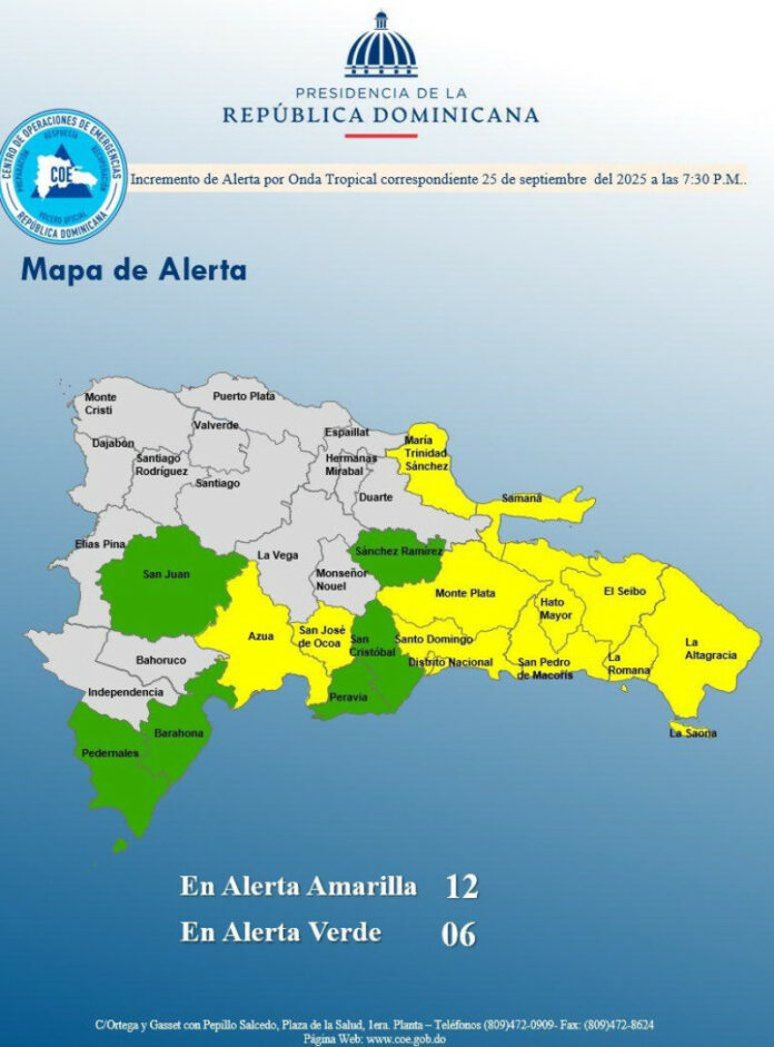 El Centro de Operaciones de Emergencias (COE) informó que 17 provincias, y el Distrito Nacional, están en diferentes niveles de alerta debido a la actividad de una onda tropical y una vaguada en la tropósfera.